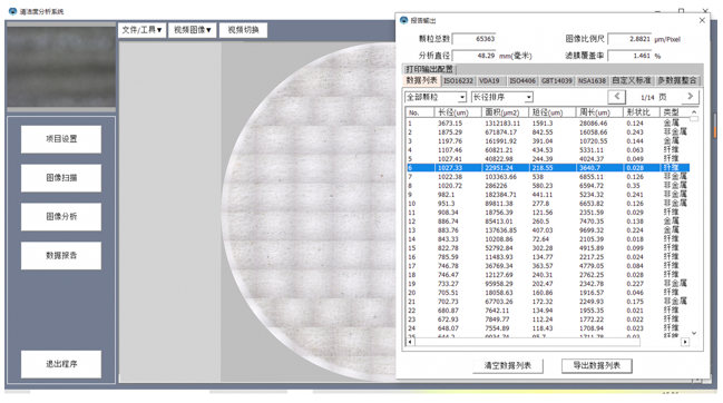 通过清洁度检测分析软件控制电子影像设备和光学放大设备,对清洗萃取后的滤纸或滤膜样本进行高精度扫描,将扫描数据传回至计算机分析软件,分析软件自动识别金属、非金属、纤维颗粒等,生成清洁度检测报告。